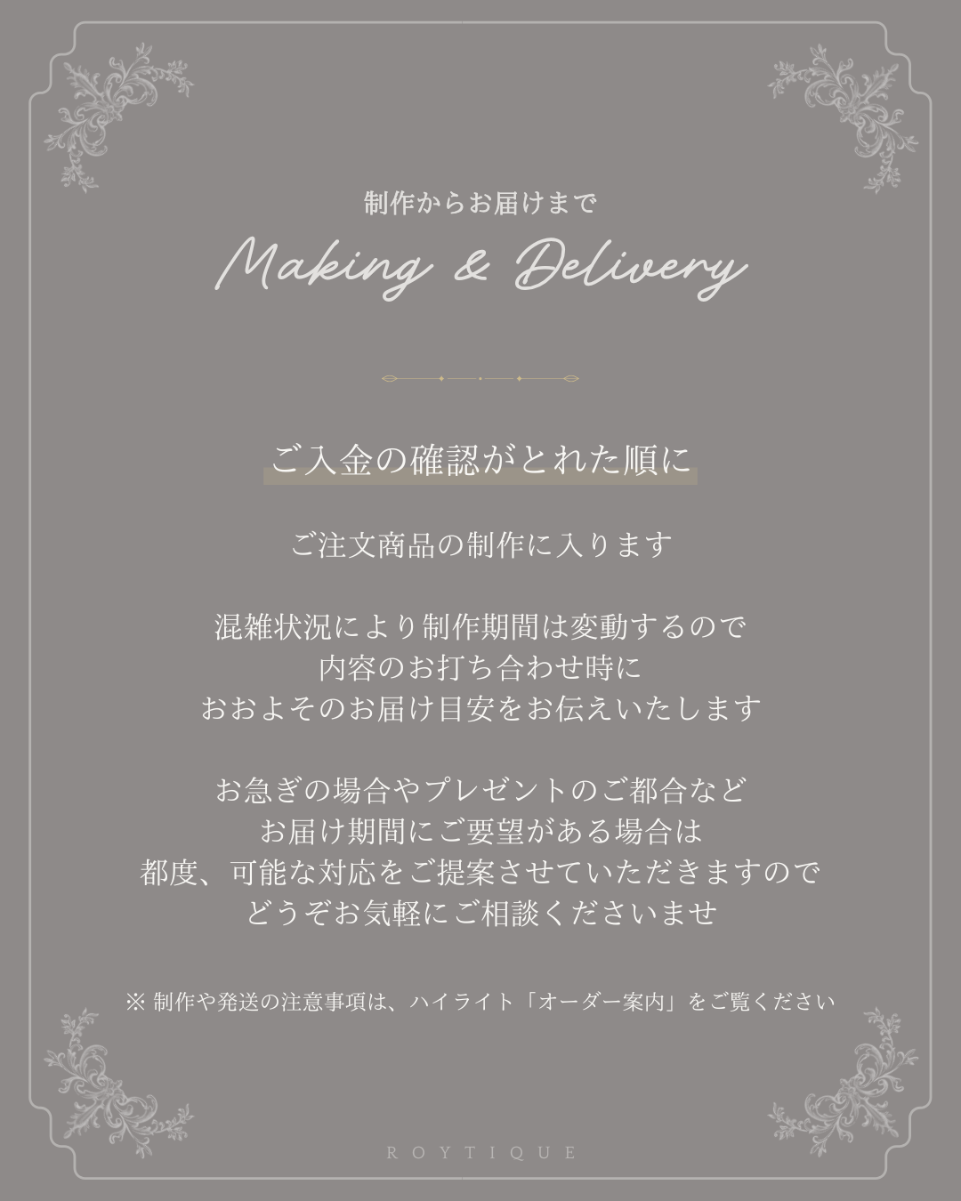 ご入金の確認がとれた順に、ご注文商品の制作に入ります。