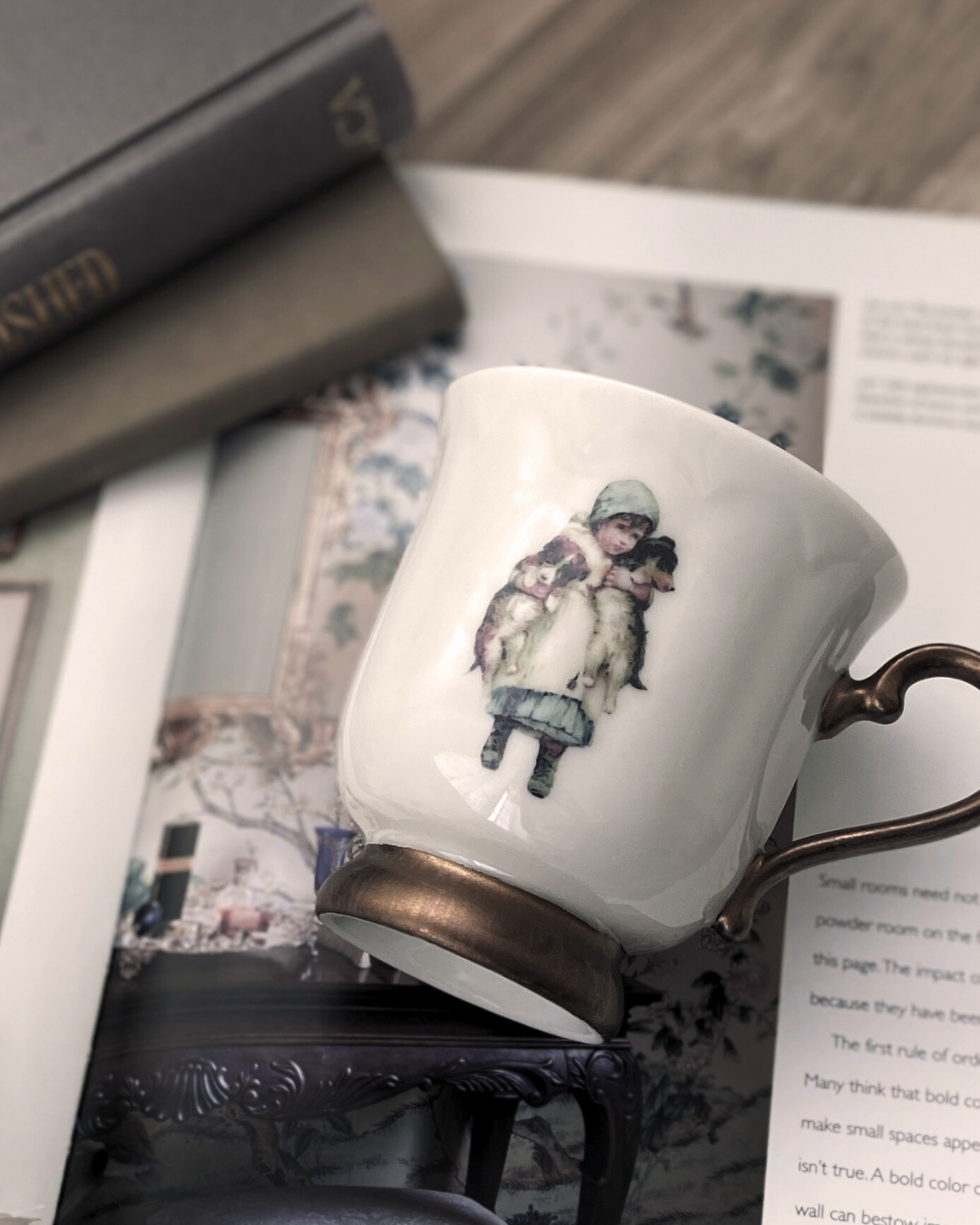 アンティークゴールドのオリジナル加工を施したマグカップ。