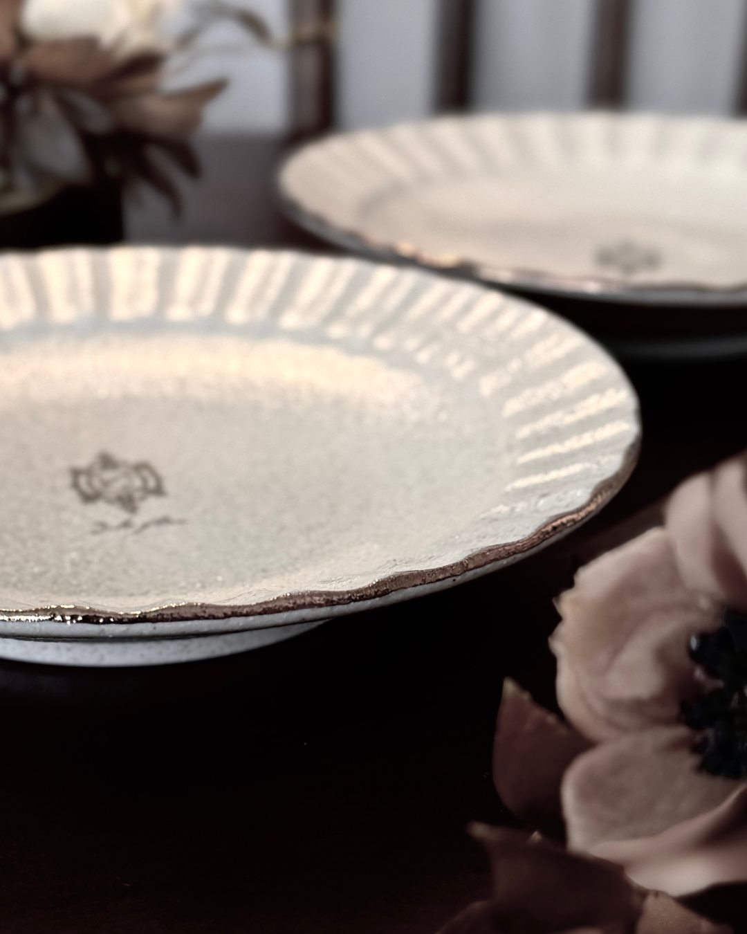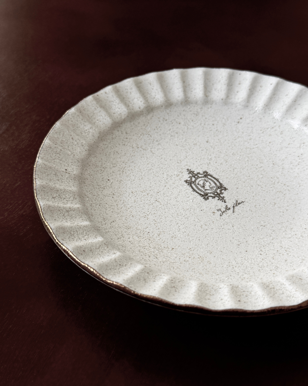 繊細なプリーツリムと中央のカメオモチーフが印象的なプレート。